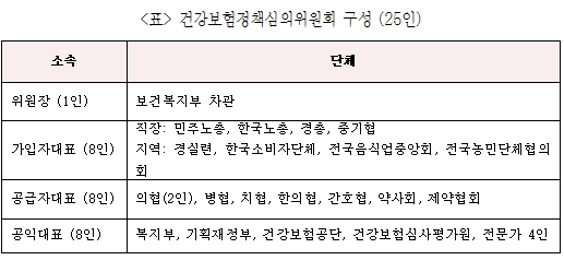 아래 <표>에서 보듯이, 건강보험정책심의위원회는 민주노총, 한국노총, 경총, 음식업중앙회 등 가입자대표 8명, 의사협회, 병원협회, 제약협회, 약사회 등 공급자 대표 8명, 정부가 임명한 공익대표 8명, 그리고 위원장인 보건복지부 차관 등 총 25명으로 구성되어 있다. 여기서 국민건강보험료뿐만 아니라 국민건강보험 재정에 큰 영향을 끼치는 의료수가, 급여적용 범위 등 국민건강보험의 모든 것이 결정된다. 그 역할의 중요성에 비해 국민들에겐 잘 알려지지 않은 사회적 정책결정기구이다.