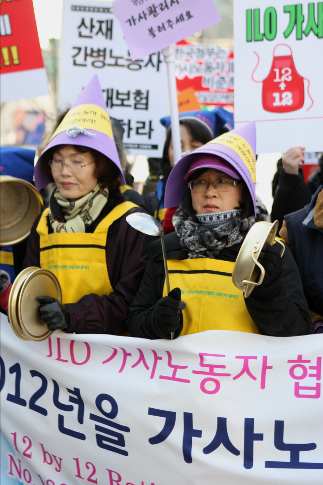 이제 인천지부는 예비사회적기업 기간이 종료되어 그나마도 보장받았던 사대보험이 자격이 상실됩니다. 앞으로 일하다 다칠 경우에 어떻게 할지 대책이 없는 실정입니다. 따라서 우리 가사노동자를 노동자로 인정하고, 우리에게 산재와 고용보험만이라도 보장하도록 법을 개정하기를 촉구합니다. 더불어 작년 ILO 가사노동자협약에 찬성표를 던진 대한민국이 빠른 시일 내에 ILO 가사노동자협약을 비준하여 건강한 가정을 위해 땀 흘려 일하는 여성가장들이 우뚝 설 수 있도록 큰 힘이 되어주기를 촉구합니다.