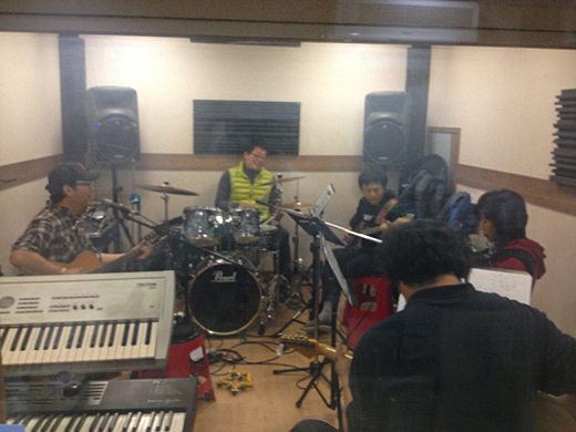 | ▲개인 콘서트를 위해 합주 연습 중인 정윤경 씨와 연주자들. 왼쪽부터 정윤경, 장석원, 박우진, 이지은, 고명원. ⓒ희망의 노래 꽃다지 |