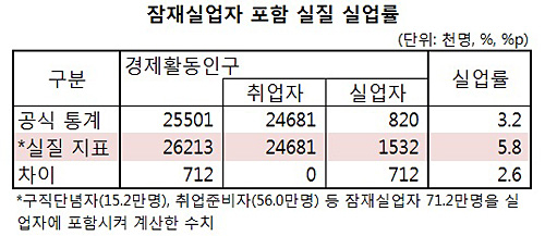 이어 잠재실업자까지 실업률 통계에 포함할 경우, 작년 실업률이 통계청 발표보다 2.6%포인트 높은 5.8%에 이른다고 계산했다. 즉 공식 실업자의 1.2배 이상의 인구가 사실상 실업 상태에 있지만, 이들이 공식 통계에서는 취업자로 분류되거나, 아예 실업률 조사 대상에서 제외돼 국내 실업률이 현실을 온전히 반영하지 못한다는 뜻이다.