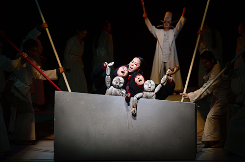 이런 두 가지 문제점은 작곡자만의 책임이 아니다. 내가 극을 보면서 계속 몰입이 안 된 채 불편했던 가장 큰 원인은 코러스의 지나친 극적 개입과 무대 안으로 들어온 도창장의 어설픈 포지셔닝이다. 이 문제는 연출의 영역에서 해결했어야 하는 문제이지 않을까 싶다. 고대 그리스 비극에서 코러스는 아주 중요한 역할을 차지하지만, 주인공의 감정을 분산시킬 정도로 극 여기저기에 개입하지는 않는다. 코러스는 어디까지나 주요 배우의 감정을 증폭시키고 그것을 지원하는 역할이지, 그 자체가 이야기를 끌어나가는 주체는 아니다.