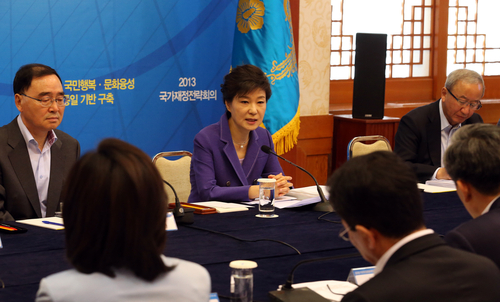 | ▲ 박근혜 대통령이 지난 5월 16일 오전 청와대에서 열린 '2013년 국가 재정 전략 회의'에서 모두 발언을 마친 뒤 회의 자료를 보고 있다. 재정 전략 회의는 정부 국정 과제를 이행하기 위한 공약가계부, 세입·세출 구조조정 등 중장기 국가 재정 운용 방안을 논의하기 위한 회의다. ⓒ연합뉴스 |
