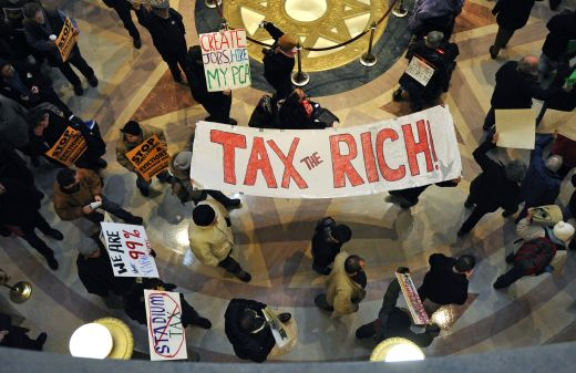 ▲ 지난해 1월 24일(현지 시각) '부자에게 과세하라'는 현수막을 들고 있는 월가 점령 시위대들. ⓒAP=연합뉴스