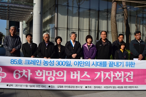 김진숙 민주노총 부산본부 지도위원이 한진중공업 정리해고 철회를 요구하며 85호 크레인에서 고공 농성을 벌인 지 300일째 되는 1일, 희망버스 기획단은 서울 용산 한진중공업 본사 앞에서 한진중공업 사측을 비판하며 6차 희망버스의 출발을 알리는 기자회견을 열었다.