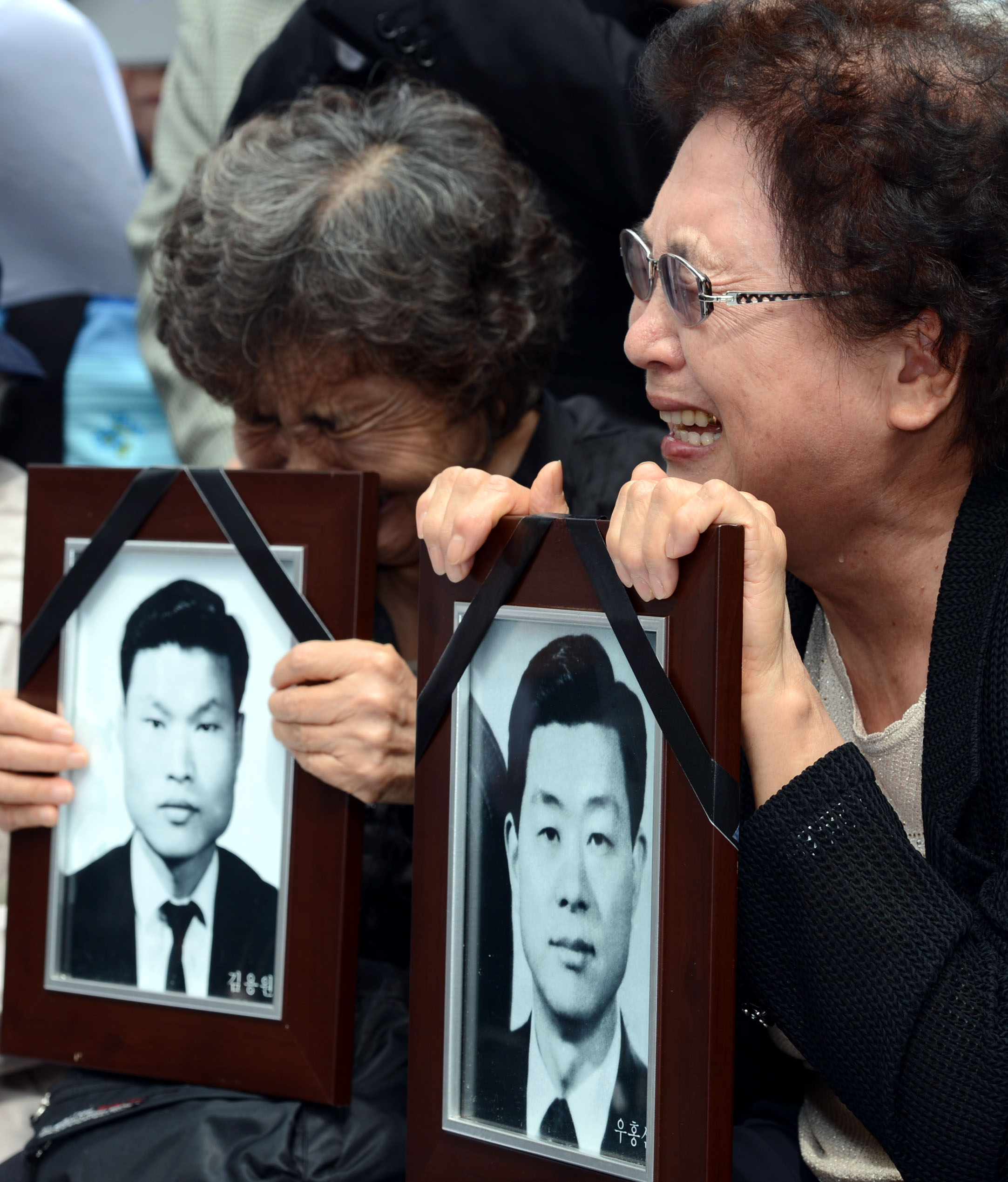 | ▲ 지난 12일 오후 서울 여의도 새누리당 앞에서 인혁당 사건 피해 유족들이 영정을 들고 박 후보 규탄 기자회견을 하며 오열을 하고 있다. ⓒ뉴시스 |