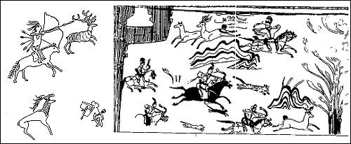 고구려의 사냥그림을 보면, 속도감과 긴장감이 가득 한 사냥터 맨 위쪽에는 백마를 타고 달리며 윗몸만 뒤로 돌린 채 암수 두 마리의 사슴을 향해 화살을 쏘는 힘찬 무사의 늘름한 모습이 그려져 있고, 중앙에는 검은 말을 탄 무사가 달아나는 호랑이를 향해 막 시위를 당기려는 포즈를 취하고 있고, 뒤따라오는 다른 무사와 사냥개가 함께 달리는 것을 잘 표현하고 있다. 맨 아래쪽에도 두 무사가 사슴과 토끼를 쫒고 있는데 현재 토끼는 아쉽게도 떨어져 나가 확인할 수 없다. 고구려가 망한 7세기 많은 고구려인들이 돌궐, 즉 우리가 지금 말하고 있는 뚜르크로 넘어간 것은 역사책에 잘 기록되어 있다. 그렇다면 혹시 고구려 화공들이 알타이까지 와서 잃어버린 조국을 그리며 이런 그림을 그린 것이 아닐까 하는 생각에 잠깐 잠겨본다.