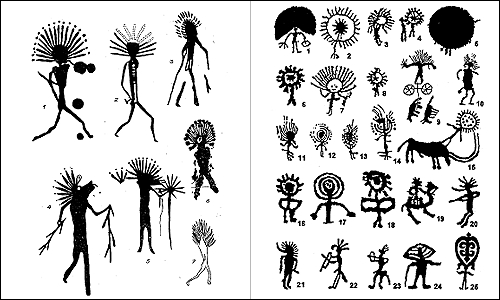 까라꼴 벽화에 보면 머리에서 햇살을 내뿜는 꼴을 한 사람들이 많이 나온다. 크기와 몇 가지 다른 특징이 있지만 대부분 둥근 머리에 사방으로 빛을 내뿜는 꼴을 하고 있다. 도대체 이런 특이한 모습을 한 사람의 모습은 무엇을 나타내려고 하는 것일까? 앞에서 꾸바레프 교수의 주장대로 탈을 쓴 것이라 해도, 그렇다면 사람이 왜 이런 탈을 썼을까? 의문이 꼬리를 문다. 까라꼴의 무덤 벽화는 다른 곳에서 그 예를 찾아볼 수 없지만 같은 시기의 바위그림에도 이와 비슷한 햇살 머리 꼴이 많이 나타난다. 그리고 바위그림을 연구하는 학자들은 이것을 해신(太陽神)이라고 한다.