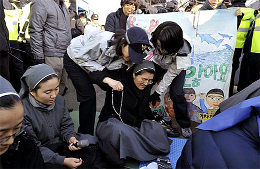 | ▲ 해군기지건설 반대 미사 중 수녀 18명이 경찰에 의해 연행되고 있다. ⓒ강정마을회 |