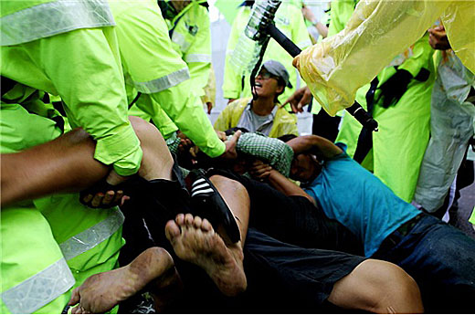 | ▲ 시위 중 끌려나가는 강정마을 평화운동가들 ⓒ조성봉 |
