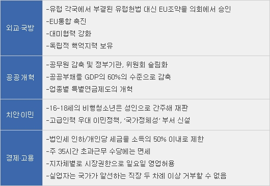 물론, 그가 법인세 인하와 공공부문의 개혁을 약속하고, 비행청소년과 불법이민자들에 대한 통제를 강화하며, 터키의 유럽연합 가입에 반대하는 등 민족주의 성향을 드러낸 것은 마치 1980년대 신자유주의 시대를 연 로널드 레이건 미국 대통령이나 대처 영국 총리를 연상시킨다. 그러나 이는 어디까지나 사르코지가 나름대로 진단한 프랑스 사회의 문제에 대한 해결책인 것이지, 미국을 추종하기 위한 맹목적 신자유주의적 정책이 아닌 것이다.