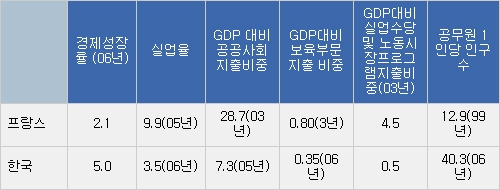 이와 함께 프랑스는 GDP대비 공공사회복지지출 비율이 2003년에 28.7%로 스웨덴 다음으로 높고, 국민부담률은 44.3%로 OECD 최고수준이며, 실업률은 최근 10년여간 10%대가 지속되고 있고, 성장률마저 지난 2006년 2.1%에 머무르고 있다. 특히 보수언론은 높은 프랑스 실업률을 언급하면서, 프랑스병의 심각성을 지적하지만 이 또한 진실의 왜곡이다. OECD 자료에 따르면 학생층과 노령층을 제외한 실질적 경제활동 인구층인 25~44살의 취업률은 미국보다 사실 조금 높다. 그나마 젊은층과 노령층의 낮은 취업률은 대부분 프랑스 사회제도의 특성에서 비롯된다. 특히 젊은층의 경우 프랑스 대학 학비는 거의 무료로, 미국 젊은이들에 비해 일할 필요가 적은 편이다.