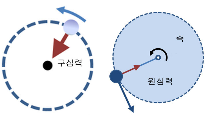 | ▲ 원심력과 구심력(왼쪽 붉은색은 구심력, 오른쪽 파란색이 원심력) |
