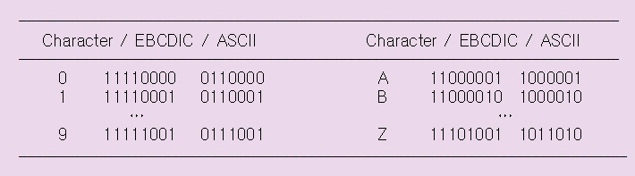 역으로 이와 같이 EBCDIC 코드는 한 바이트가 8bit로 구성되어 있고, ASCII 코드는 한 바이트가 7 bit으로 구성되어 있다. 8 bit로 하나의 문자를 나타내면 상위(맨 앞)의 4 bit는 zone bit, 나머지 하위(뒤)의 4bit는 digit bit라고 한다. |