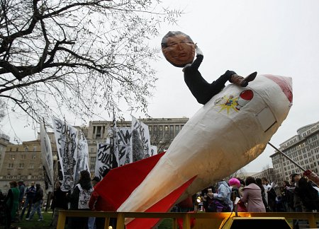 ▲ 반전주의자들이 조지 W. 부시 대통령과 미사일을 상징하는 모형을 세워두고 워싱턴에서 시위를 벌이고 있다. ⓒ로이터=뉴시스