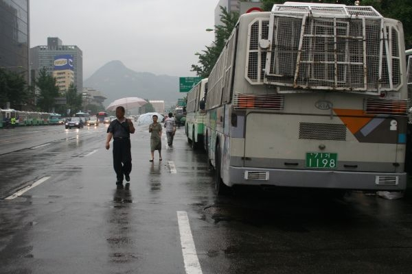 | ▲시청에서부터 광화문까지 늘어선 경찰 버스들. 그 곁을 걷는 시민들. ⓒ프레시안 |