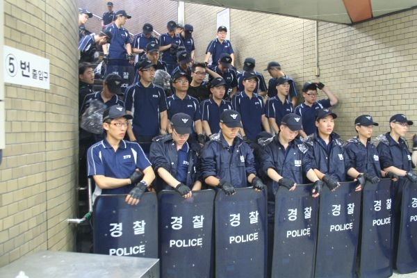 | ▲시청 앞 광장으로 이어지는 지하철 출구를 봉쇄한 경찰들. ⓒ프레시안 |