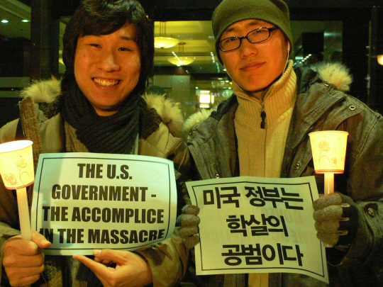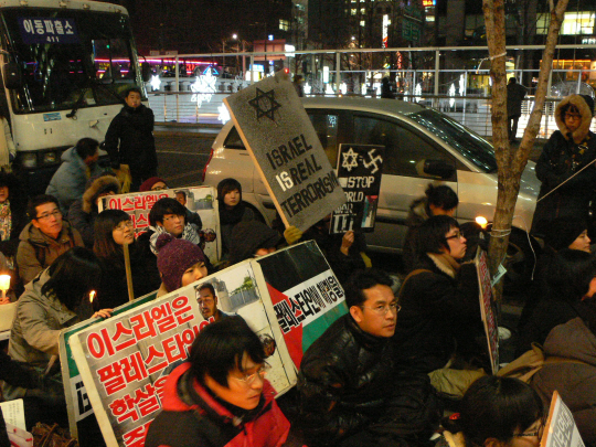 이날 촛불문화제에는 한국에서 그간 열린 팔레스타인 관련 집회·행사 중 최대인 200여 명의 시민들이 모여 이스라엘의 가자 공격을 비난했다. 참가자들은 '그들에게 땅을 그들에게 평화를, 새해를' '침략지원 미국은 학살을 중단하라' '이스라엘은 진짜 테러리스트' '가자 봉쇄를 중단하라' 등의 구호를 적은 각종 피켓과 선전물, 그리고 촛불을 들고 나왔다.