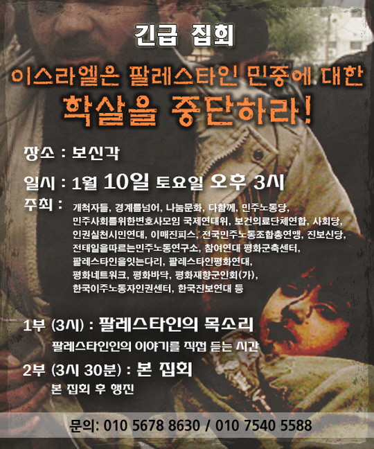 이날 문화제는 런던, 파리 등 유럽 주요 도시에서 각각 수 만 명, 워싱턴에서 1만5000명, 이집트에서 10만 명 등 전세계에서 이어지고 있는 이스라엘 규탄 집회의 일환으로 열렸다. 주최 측은 주말인 오는 10일 오후 3시에는 서울 도심에서 각종 시민사회 단체가 참여하는 대규모 집회를 열 계획이라고 밝혔다.