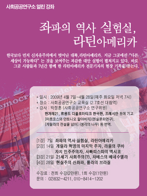 우리 한국도 미국을 비롯한 강대국의 틈바구니 속에서 더 자유롭고 정의롭고 평등한 세상을 만드는 노력을 지속적으로 해왔습니다. 한국에서도 라틴아메리카처럼 역동적인 진보정치가 이뤄지기를 바랍니다. 우리가 진짜 라틴아메리카에서 배울 것이 있다면 바로 정답이 없는 세상에서 자신들의 고유한 역사적 경험을 만들어가는 정신일 것입니다.