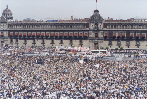 하지만 94년 1월 1일 무장봉기 이후 사정은 확연히 달라집니다. 봉기 발생 직후 멕시코시티 최대 광장에는 10만 명의 시민들이 집결해 "우리 모두가 마르코스"라고 외치며 원주민 게릴라에 대한 군사공격을 중지하라고 호소합니다. 또한, 유럽과 북미의 공감하는 시민들과 지식인들이 멕시코 정부에 대규모 항의 메일을 보냅니다.