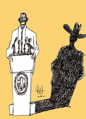 오바마 시대를 일관되게 괴롭힐 것은 바로 그것이다. 그 속에서 오바마는 미국 헌정주의 원칙을 절대적으로 추구하는 민권단체와 '테러 전쟁에서 중간 지대는 없다'며 절대적 타락을 옹호하는 네오콘들 사이에서 다소 위태위태한 줄타기를 할 것이다.