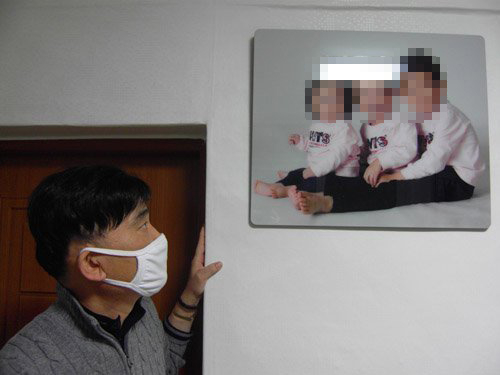 ▲ 지난 1월 29일 찾은 임성호 씨의 집에는 벽마다 아이들의 사진이 가득했다. 임성호 씨가 세 아이의 사진을 보며 이야기하고 있다. ⓒ프레시안(남빛나라)
