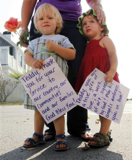 | ▲ 에드워드 케네디의 서거 소식이 전해진 26일 메사추세츠주 그의 집 입구에서 아이들이 애도의 피켓을 들고 있다. "테디, 우리 나라와 우리 동네, 우리 가족을 위해 일해줘서 고마워요" ⓒ로이터=뉴시스 |