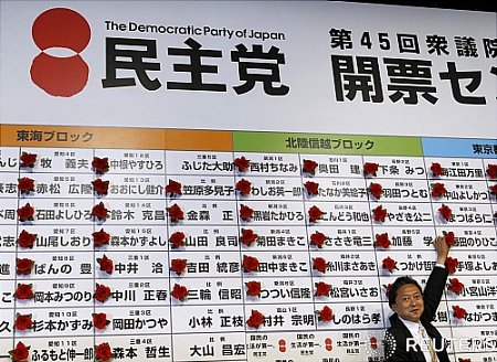 | ▲ 하토야마 유키오 민주당 대표가 압승을 자축하고 있다. 하지만 공약 이행에 대한 부담은 커져만 가고 있다. ⓒ로이터=뉴시스 |