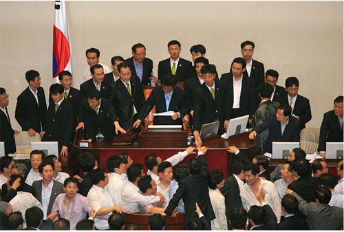 | ▲ 한나라당 의원들과 국회 경위들의 호위 속에 의사봉을 두드리고 있는 이윤성 부의장. ⓒ프레시안 |