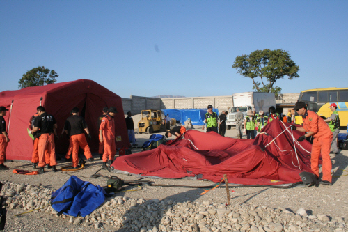 | ▲ 포르토프랭스에 도착해 캠프를 짓는 한국 구조대원들 ⓒ프레시안 황준호 기자 |