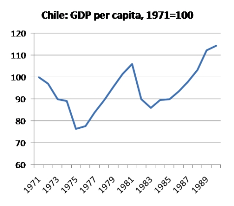 | "시카고 보이의 경제적 성취는 환상" 3일(현지시간) 노벨경제학상 수상자 폴 크루그먼 프린스턴대 교수도 'Fantasies of the Chicago Boys'라는 블로그에서 시카고 보이들이 이뤄냈다는 경제발전이나 연금제도는 환상이라고 꼬집었다. 크루그먼 교수에 따르면, 칠레의 연금제도는 한 때 세계가 주목할 만한 이상적인 제도로 선전되었으나, 많은 사람들에게 '빛좋은 개살구'라는 것이 드러나 지금은 칠레 국민도 증오하는 제도가 되었다. 칠레가 지진에도 불구하고 상대적으로 사망자가 적은 것은 밀턴 프리드먼이 옳았다는 증거라는 주장에 대해 크루그먼 교수는 프리드먼의 과거 인터뷰 발언을 제시하며 반박했다. 프리드먼은 건축 법규를 선호하는 편이 아니었다는 것이다. 사람들이 개인적으로는 원하지 않는 비용을 강요한다는 의미에서 프리드먼은 '정부 지출의 한 형태'라고 불렀다. 이어 크루그먼 교수는 피노체트 정권 하에서 칠레의 경제정책이 거두었다는 업적은 환상이라고 일축했다. 자유시장주의자들이 칠레를 개방해 경제호황을 이뤘다는 이야기는 근거가 없다는 것이다. 크루그먼 교수는 칠레의 1인당 GDP 변천을 보여주는 도표(하단 참조)를 제시하며 실제로 진행된 칠레의 경제변화를 설명했다. 크루그먼 교수에 따르면, 칠레는 1970년대 초 심각한 경제위기를 겪었다. 아옌데 정부의 실정과 쿠데타 등에 따른 혼란 탓도 있다. 이후 칠레는 대대적인 자본 유입에 힘입어 경제가 회복됐지만 대부분 원상복귀 수준이었다. 다시 1980년대초에 큰 위기가 있었다. 라틴아메리카의 부채 위기에 속하는 것이지만 칠레는 다른 주요 경제국들에 비해 훨씬 큰 타격을 받았다. 칠레가 1970년대초에 비해 확실하게 앞서나가게 된 것은 강경한 시장주의 정책들이 뚜렷하게 완화된 1980년대말이 되어서다.