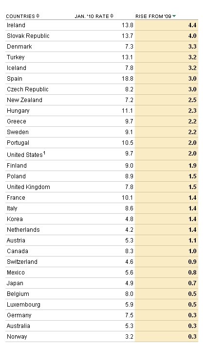 절대 실업률을 기준으로는 스페인이 가장 높았다. 지난 1월 스페인의 실업률은 18.8%에 달했고, 실업률 증가 1위인 아일랜드가 2위(13.8%), 그리고 슬로바키아(13.7%), 터키(13.1%), 헝가리(11.1%), 포르투갈(10.5%) 등의 순이었다.
