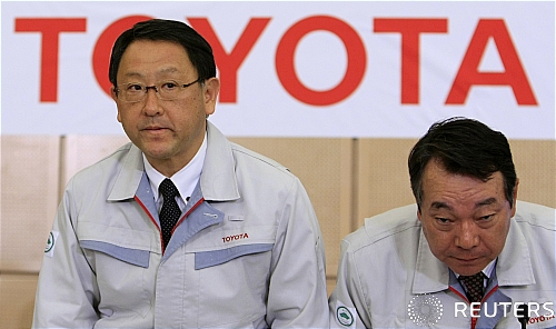 ▲ 토요타(Toyota)의 수모가 계속되고 있다. 사진은 대규모 리콜 사태로 사죄의 뜻을 밝히는 도요다 아키오(Toyoda Akio) 사장(왼쪽). 등 토요타 자동차의 임원들. ⓒ로이터=뉴시스