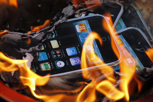 ▲ 팍스콘 자살 사태에 항의하는 사람들이 아이폰 모양의 종이를 불태우며 불매운동을 벌이고 있다. ⓒ로이터=뉴시스