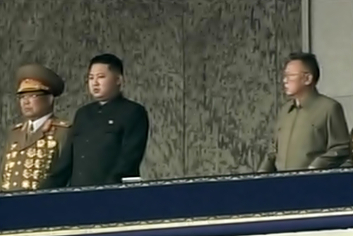 | ▲ 김정일 국방위원장이 10일 노동당 창건 65주년 열병식 주석단에서 바로 옆에 서 있는 아들 김정은을 바라보고 있다. ⓒ조선중앙TV=연합뉴스 |