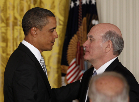 ▲ 버락 오바마 대통령이 지난 6일 빌 데일리를 비서실장에 임명한다는 발표를 한 뒤 격려하고 있다. ⓒ로이터=뉴시스 |