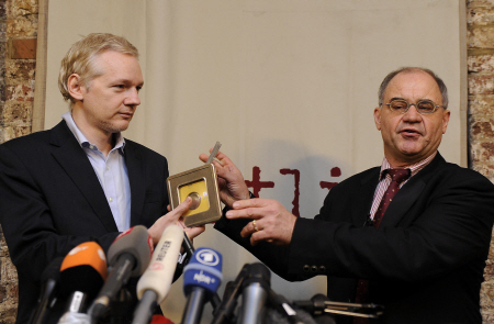 ▲ 위키리크스 설립자 어산지가 스위스 비밀계좌 정보가 담긴 CD를 건네받고 있다. ⓒ로이터=뉴시스 |