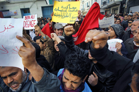 | ▲ 지난 14일 튀니지 주민들이 독재자 벤 알리의 퇴진을 요구하며 대대적인 시위에 나섰다. 수십년간 독재에 시달리던 주민들의 분노가 폭발한 배경에는 정치적인 이유뿐 아니라, 최근 식품가격 폭등이 있다. ⓒAP=연합 |
