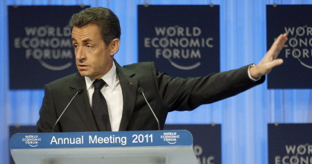 ▲ 니콜라 사르코지 프랑스 대통령 27일 다보스 포럼에서 유로화에 대한 강력한 방어 의지와 글로벌 금융개혁 등에 대해 연설하고 있다. ⓒAP=연합 |
