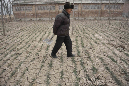 ▲ 200년만의 가뭄에 시달리는 중국 산둥성의 말라비틀어진 밀밭 위를 한 농부가 허탈한듯 걷고 있다. ⓒ로이터=뉴시스 |