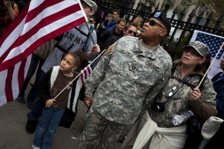 ▲ 오사마 빈 라덴의 사망 소식에 한 미국인 부부가 군복을 입고 군사적 응징에 대한 지지를 표시하고 있다. 하지만 빈 라덴 사후 미국에 대한 테러 위협은 증가하고 있다. ⓒAP=연합 |