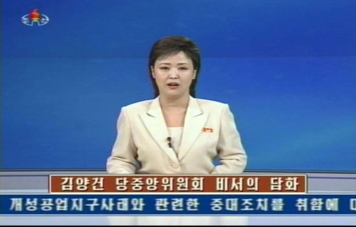 | ▲ 북한은 8일 김양건 노동당 대남 담당 비서의 담화를 통해 '공업지구사업을 잠정중단하며 개성공업지구에서 일하던 우리 종업원들을 전부 철수한다'고 밝혔다. 조선중앙TV 아나운서가 김 비서의 담화를 발표 하고 있다.ⓒ연합뉴스 |