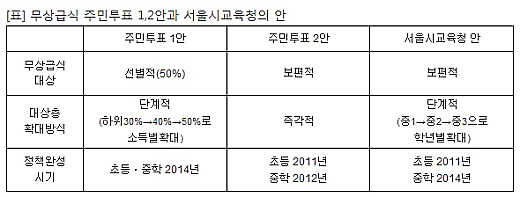 첫째, 주민투표에 부쳐지는 1안과 2안 중 어느 것도 서울시교육청의 정책안과 일치하는 것이 없다. 투표용지에 기재될 1안은 소득 하위 50% 학생을 대상으로 2014년까지 단계적으로 무상급식을 실시하는 것이고, 2안은 모든 학생을 대상으로 초등학교는 2011년부터, 중학교는 2012년부터 전면적으로 무상급식을 실시하는 것이다.