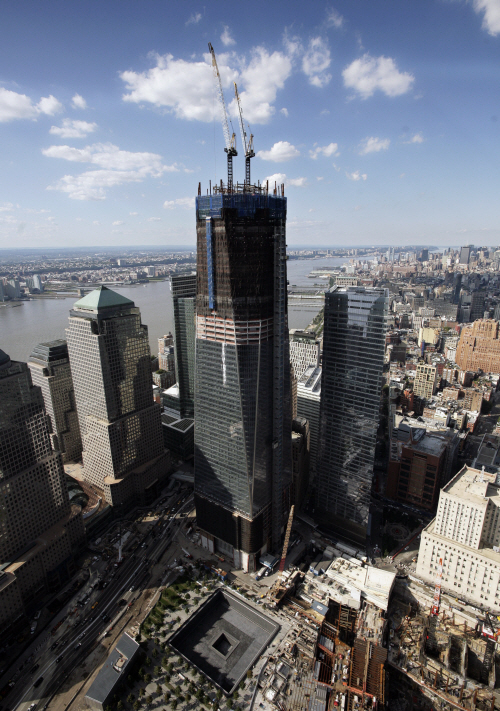 | ▲ 새로 지어지는 WTC. 사진 중앙 하단의 정사각형 모양 구조물이 9.11 기념관이다. ⓒAP=연합뉴스 |