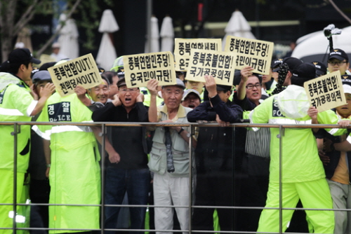 | ▲24일 보수단체 회원으로 보이는 이들이 가두행진하는 민주당 의원들에게 손팻말을 들어 보이며 소리치고 있다. ⓒ프레시안(최형락) |