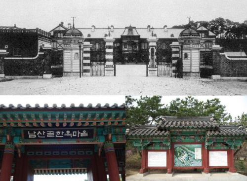 | ▲ (위) 조선헌병대 사령부. 1908년 조선주차군 사령부가 용산(지금의 미군 기지 자리)으로 이전할 때까지는 두 사령부가 이곳을 함께 사용했다. 조선헌병대는 1919년 3·1운동을 가장 잔인하게 진압한 부대였다. 또 제3대 총독 사이토(齋藤實, 1858~1936년)의 "문화 통치" 이전인 1910년대에는 군인뿐만 아니라 민간인까지 대상으로 한 "헌병 경찰"의 중추로서, 경찰 담당인 위생 업무도 강압적으로 수행했다. 1910년 8월 29일 "일한 병합 조약"을 공포할 때에도 무력 시위의 핵심 역할을 했다. (아래) 지금은 그 자리에 남산골 한옥마을이 자리 잡고 있다. 안내판에는 조선헌병대 등에 대한 언급이 전혀 없다. ⓒ프레시안 |