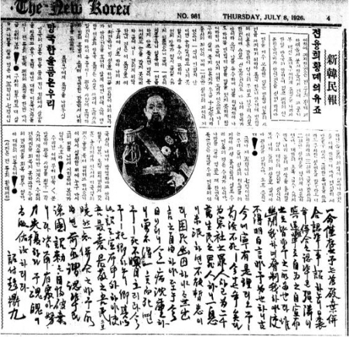 | ▲ 미국 샌프란시스코에서 발행된 <신한민보> 1926년 7월 8일자. 융희 황제(순종)가 세상을 떠나기 전에 조정구(趙鼎九, 1862~1926년)에게 내렸다는 유언(遺詔)이 실려 있다. ⓒ프레시안 |