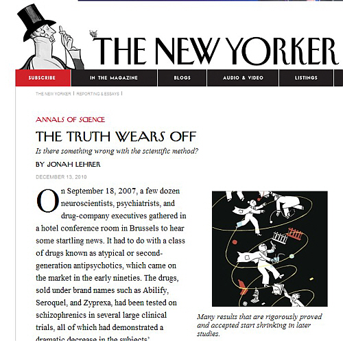 이런 세태를 놓고 지난 2010년 12월 미국 잡지 <뉴요커>는 현재의 과학적 방법론이 과연 올바른지를 놓고 한 편의 기사("진실이 사라지다 : 우리의 과학적 방법론에 오류가 있는가?)를 실었다. (☞관련 기사 : The Truth Wears Off: Is there something wrong with the scientific method?)