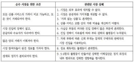 2장 '순수 시장이라는 불가능한 꿈'은 신자유주의가 신성시하는 자유 시장의 특징과 한계를 설명한다. 신자유주의자들은 흔히 국가 공공서비스는 무능하고 교만한 데 반해, 자유 시장은 소비자 선호에 민감하고 경제적 자원도 효율적으로 배분한다고 말한다. 크라우치가 보기에도 그런 주장이 전혀 일리가 없는 것은 아니다. 그러나 시장이 그와 같은 기능을 수행하기 위해서는 몇 가지 조건이 충족되어야 하는데, 그럴 수 없는 '시장 실패'의 경우 정부의 시장 관여는 불가피할 뿐만 아니라 정당한 일이 된다. 아래 표는 크라우치가 지적한 순수 시장을 위한 요건과 관련된 시장 실패를 요약한 것이다.