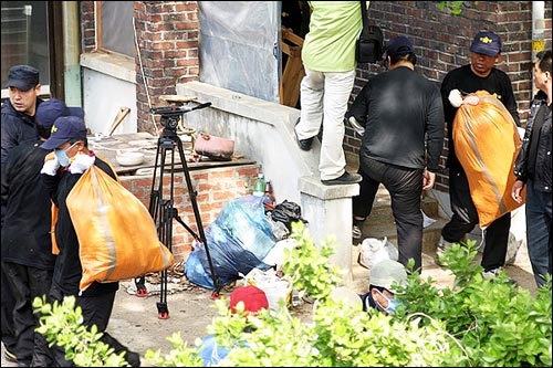 | ▲ 범대위 활동가들이 머물던 집의 가재도구를 끌어내고 있는 용역 직원들. ⓒ프레시안 |